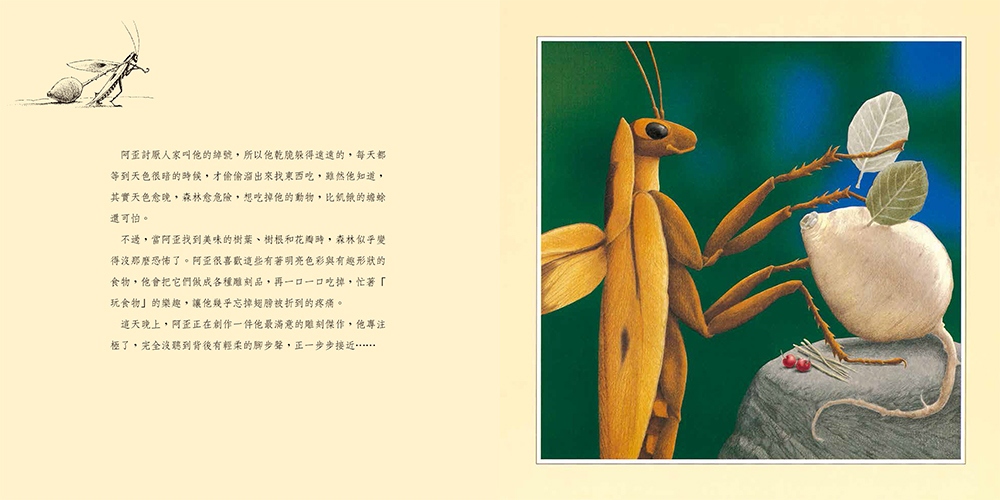 不過,接連幾晚,他都還來不及享用自己精心雕刻的藝術晚餐,就慘遭體型比他大上好幾倍的生物──大眼猴、蜥蜴、豹貓──的騷擾攻擊,每天連一頓飯都沒法子好好吃不說,小命更是差點不保。阿歪覺得受夠了,他恨自己長得那麼小,為了躲避巨大的獵食者,只能不停的逃跑、逃跑、逃跑。